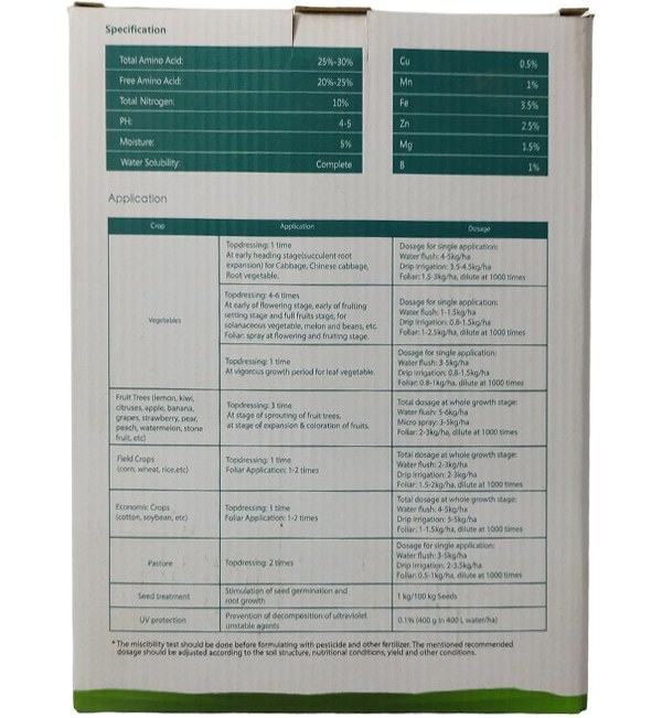 موارد مصرف: محلولپاشی برگی برای تمامی گیاهان؛ مناسب برای تأمین عناصر میکرو، افزایش گلدهی و سبزینگی و کاهش ریزش میوه؛ میزان مصرف: ۱–۲ در هزار.
